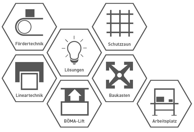 Laadukkaat aluminiosat, teräsprofiilit sekä rakenneosat takaavat toimivan kokonaisuuden. Oli sitten kyseessä kuljetinhihna, yksittäinen työpiste tai hissijärjestelmä tuotannossa BÖMA valmistaa asiakkaan toiveen mukaan yksilöityjä järjestelmiä. Profiileja, hihnoja sekä rakenneosia voi ostaa myös erikseen.